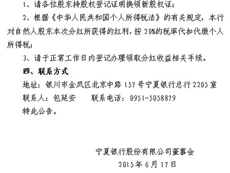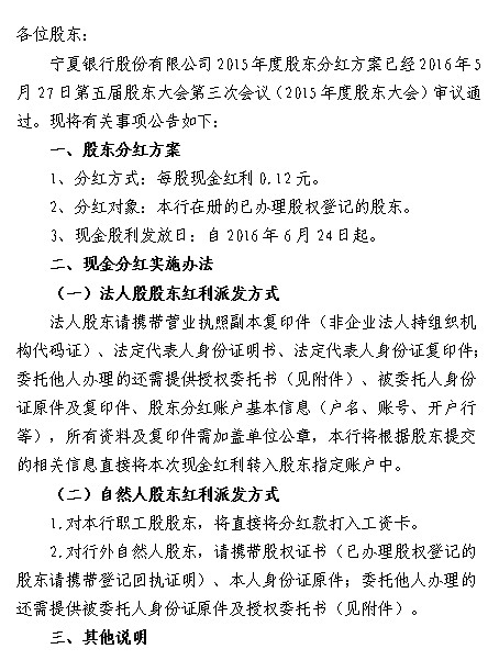 寧夏銀行股份有限公司2015年度股東分紅公告