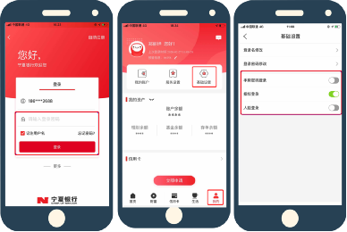 第三步使用您剛才設(shè)置的用戶名及登錄密碼登錄手機(jī)銀行(也支持銀行賬戶或手機(jī)號碼與登錄密碼組合進(jìn)行登錄);登錄成功后可進(jìn)入“我的”,點擊“基礎(chǔ)設(shè)置”;設(shè)置自己喜歡的手勢/指紋/人臉等登陸方式。